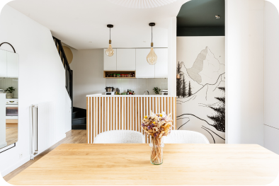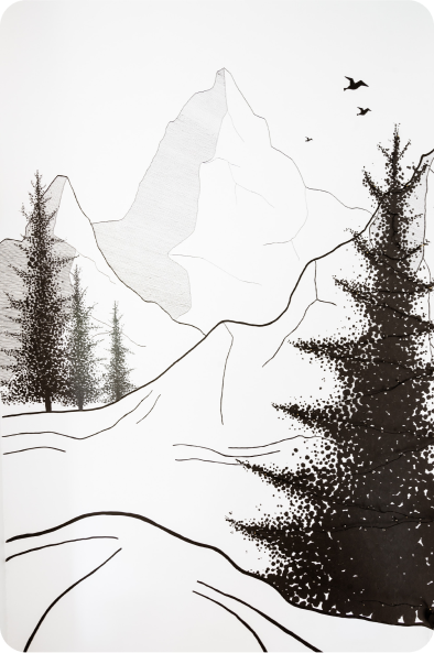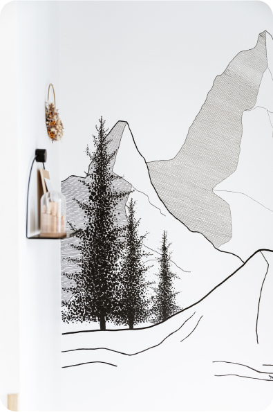 Pour cette fresque murale, j'ai voulu recréer une ambiance de montagne qui me tient particulièrement à cœur. Le décor mêle des éléments peints et dessinés : la peinture au plafond délimite l'entrée, tandis que les sapins peints ajoutent un léger relief et de la texture à l'espace. Les montagnes, dessinées au posca, apportent une touche graphique et minimaliste.