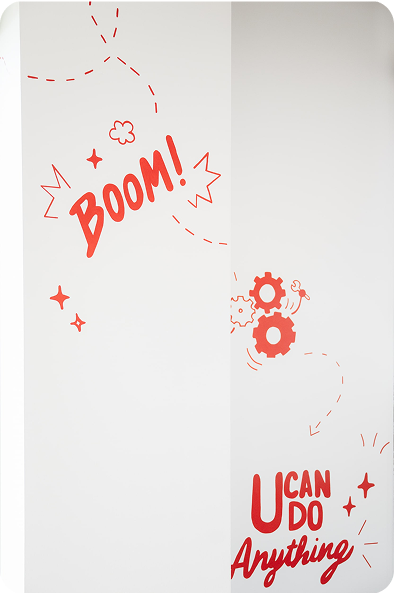 se compose de mots, d’anecdotes et de petits dessins dispersés sur les murs, avec