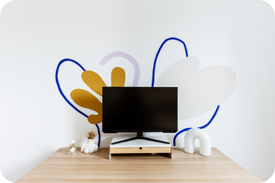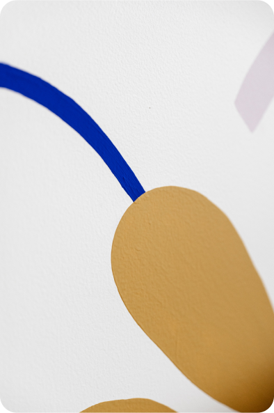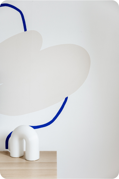 Cette fresque murale se trouve sur le mur du bureau, en face de celle du projet Cocon. Conçue comme un arrière-plan à l'écran d'ordinateur, elle complète l'ambiance de l'espace de travail avec ses formes organiques aux mêmes teintes que le projet Cocon. La ligne bleu Klein, fil conducteur de la composition, relie les éléments et unifie l'ensemble. Bien que les fresques soient sur deux murs opposés, elles se complètent et créent une continuité visuelle.