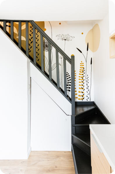 Réalisée lors de ma première formation avec Les Frescoeurs, cette fresque combine des motifs floraux et des formes géométriques. Mélangeant peinture et dessins au Posca noir, elle se distingue par le caractère apporté par le Posca. Les éléments peints forment un arrière-plan, mettant ainsi en valeur les dessins au premier plan.