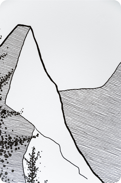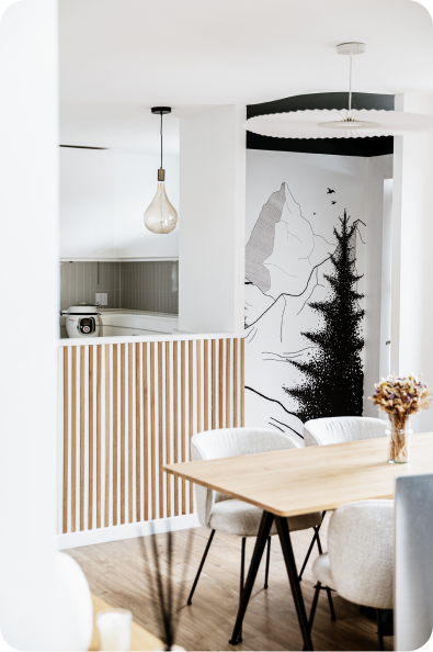 Pour cette fresque murale, j'ai voulu recréer une ambiance de montagne qui me tient particulièrement à cœur. Le décor mêle des éléments peints et dessinés : la peinture au plafond délimite l'entrée, tandis que les sapins peints ajoutent un léger relief et de la texture à l'espace. Les montagnes, dessinées au posca, apportent une touche graphique et minimaliste.
