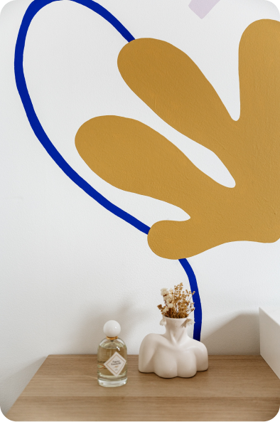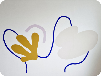 Cette fresque murale se trouve sur le mur du bureau, en face de celle du projet Cocon. Conçue comme un arrière-plan à l'écran d'ordinateur, elle complète l'ambiance de l'espace de travail avec ses formes organiques aux mêmes teintes que le projet Cocon. La ligne bleu Klein, fil conducteur de la composition, relie les éléments et unifie l'ensemble. Bien que les fresques soient sur deux murs opposés, elles se complètent et créent une continuité visuelle.
