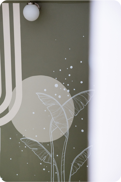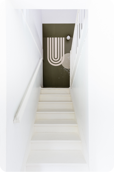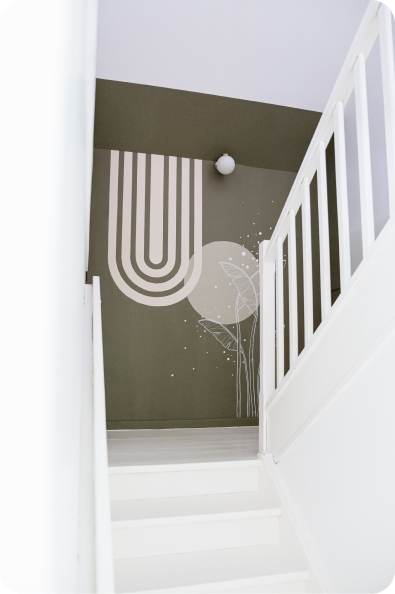 Pour cette fresque, j'ai travaillé avec un cadrage coloré, ou une 'boîte de couleur', afin de mettre en valeur la composition et de structurer l'espace. Ce choix accentue l'impression de profondeur, donnant l'illusion que le palier est plus grand. Les teintes choisies apportent du dynamisme et harmonisent l'ensemble, tout en créant un contraste interéssant avec les murs environnants.