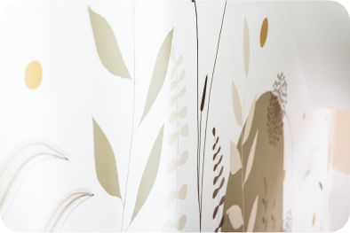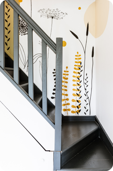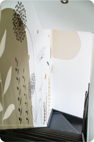 Réalisée lors de ma première formation avec Les Frescoeurs, cette fresque combine des motifs floraux et des formes géométriques. Mélangeant peinture et dessins au Posca noir, elle se distingue par le caractère apporté par le Posca. Les éléments peints forment un arrière-plan, mettant ainsi en valeur les dessins au premier plan.